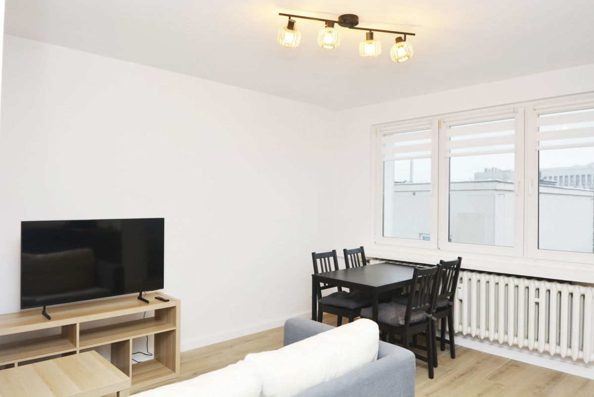 Salon urządzony jest komfortowo - sofa, stolik kawowy, stolik RTV z telewizorem, szybki Internet światłowodowy oraz duży stół z czterema krzesłami to idealne miejsce do pracy zdalnej, relaksu i spotkań.
