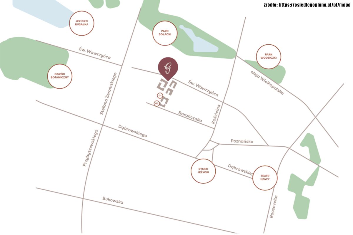 Nowoczesne osiedle Goplana wyróżnia się świetną komunikacją i dostępem do terenów zielonych. Spokojna, przyjazna okolica to doskonałe miejsce do zamieszkania zarówno dla singli, jak i par. W pobliżu znajdziesz liczne sklepy, apteki i punkty usługowe, a także dogodny dojazd do centrum miasta dzięki licznym liniom autobusowym.