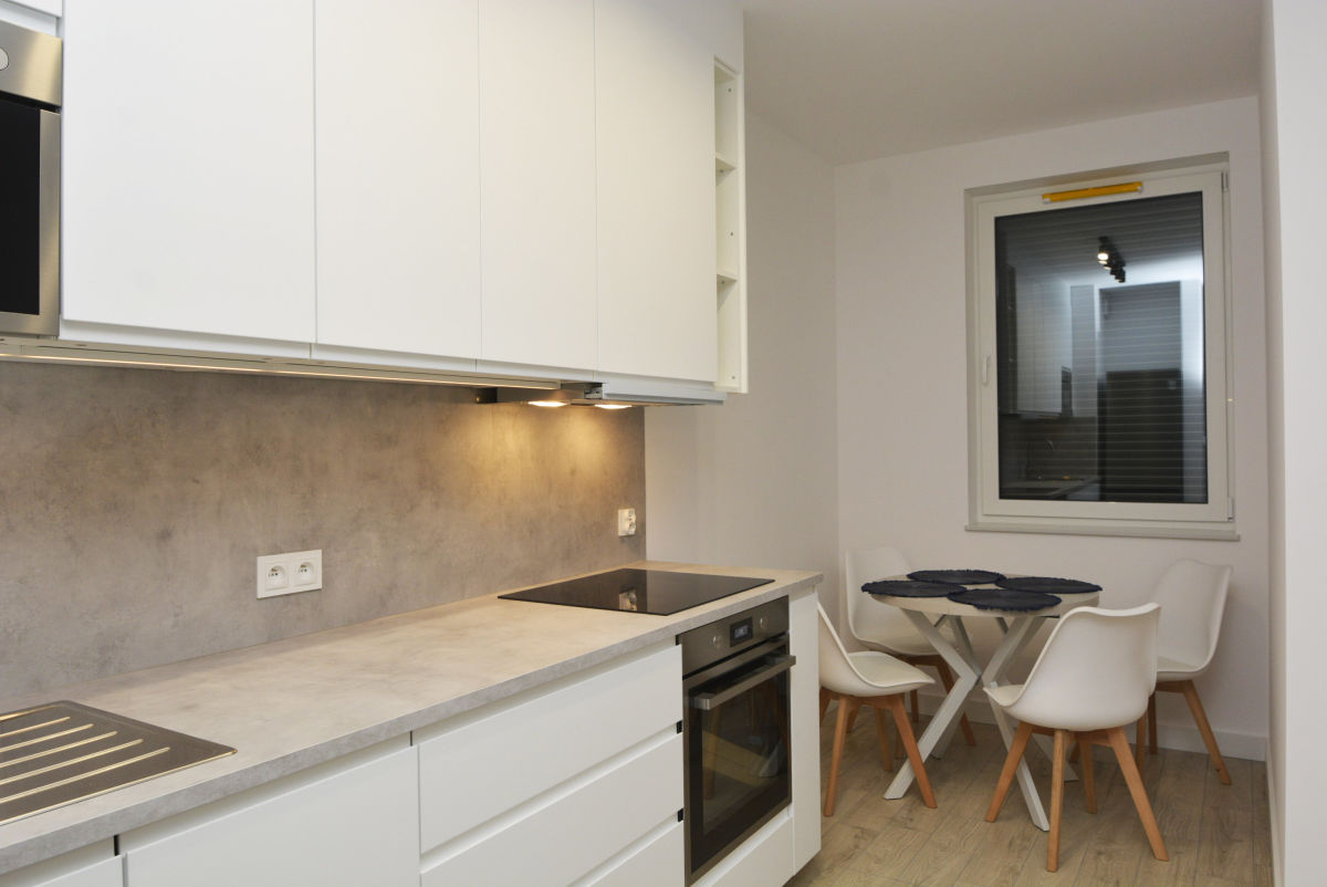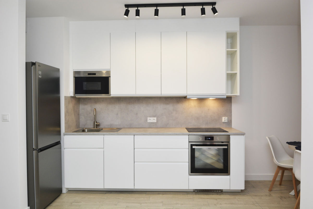 - Kuchnia w zabudowie - lodówka, piekarnik, mikrofalówka, zmywarka, płyta indukcyjna oraz pełne wyposażenie w naczynia, garnki, sztućce